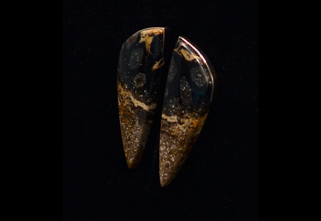 Kõrvarõngad. Kuld ja kivistunud puit.