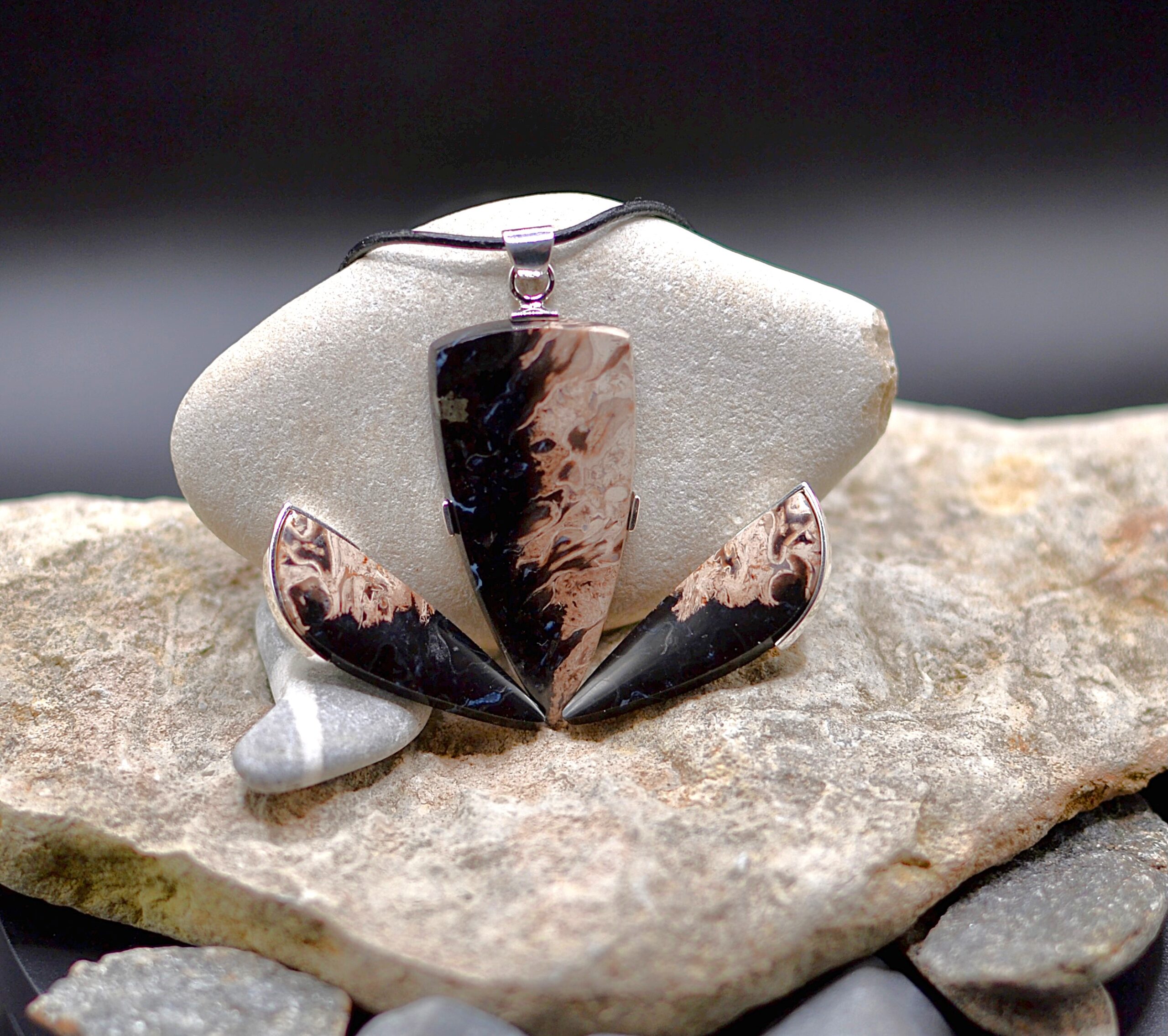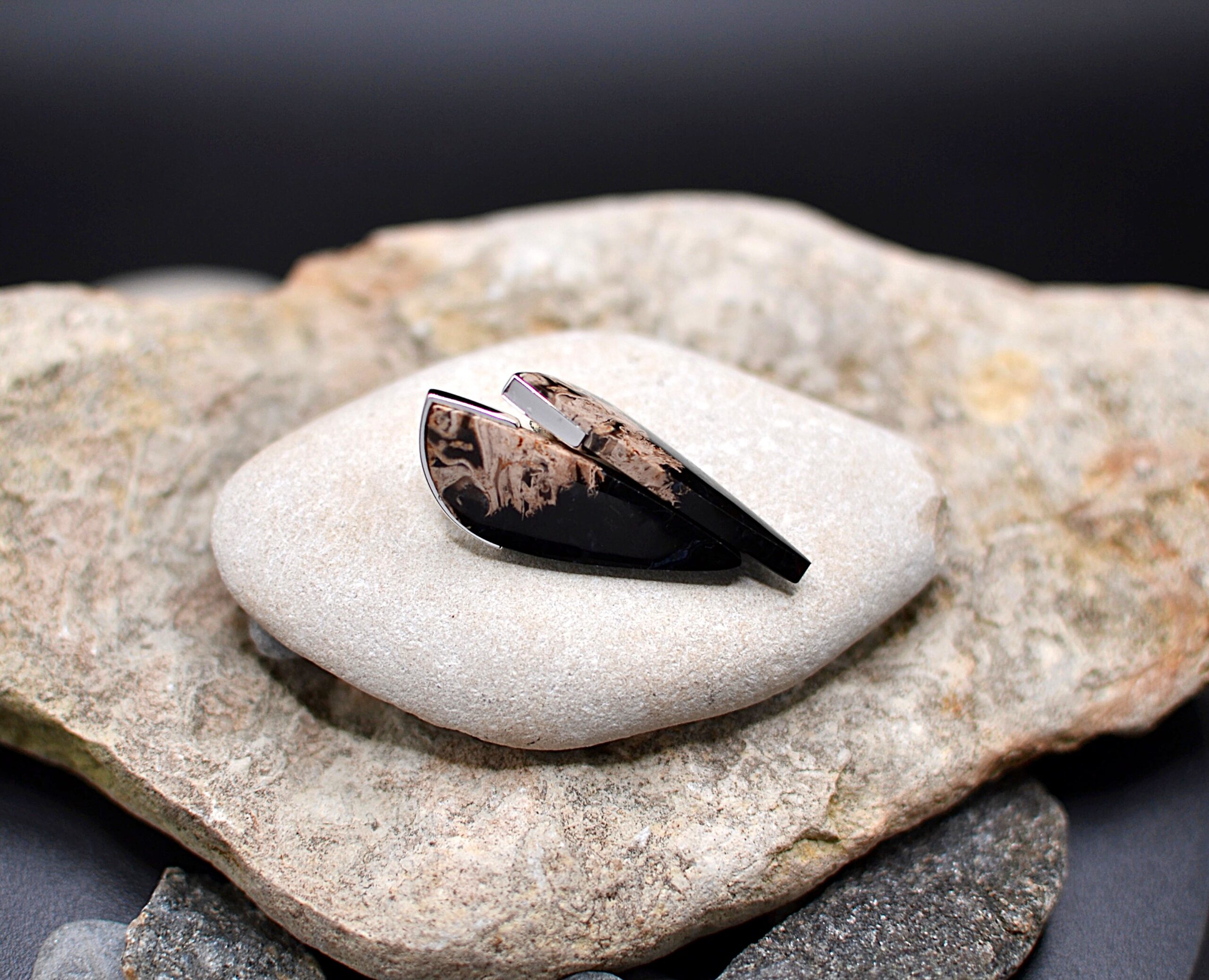 Komplekt – kõrvarõngad ja ripats. Hõbe (925) ja kivistunud puit.