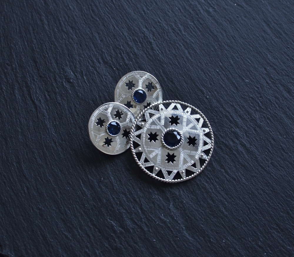 Hõbedast (925) sõlg koos kõrvarõngastega. Kivideks sinised spinellid.